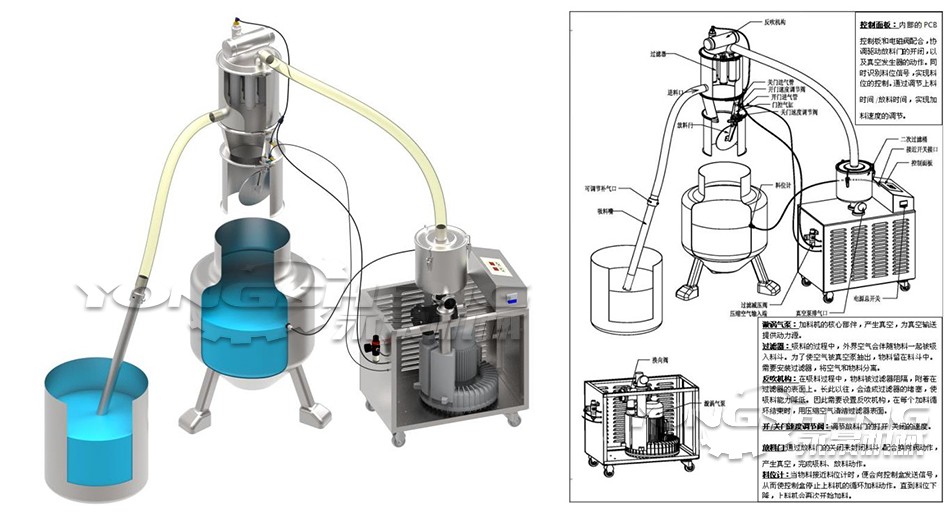 真空吸料機(jī),是一種借助于真空吸力來傳送顆粒和粉末狀物料的無塵密閉管道輸送設(shè)備,利用真空與環(huán)境空間的氣壓差,形成管道內(nèi)氣體流動,帶動粉狀物料運(yùn)動,從而完成粉體的輸送。我國引進(jìn)國外真空技術(shù),不斷完善,不斷改進(jìn),現(xiàn)廣泛用于化工、制藥、食品、冶金、建材、農(nóng)副等各輕、重工業(yè)行業(yè)。