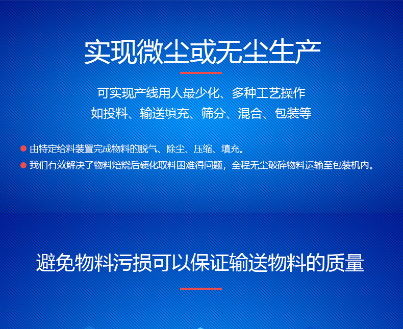 ●專用的脫氣裝置可以將細粉中所含的空氣排出,保證物料填充后的密實度極高,并且能比人工多裝一到二公斤物料。
